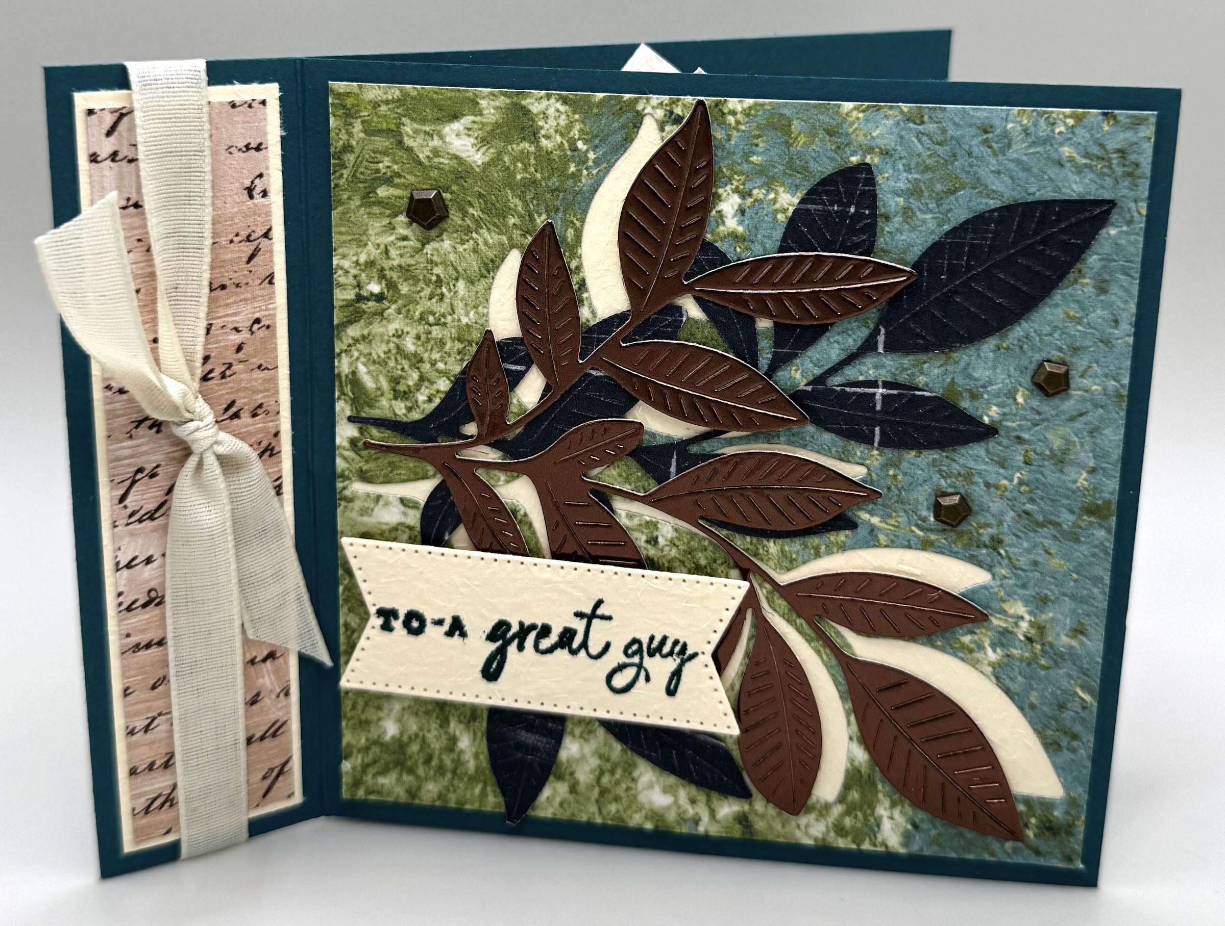 I had several fellow crafters ask me to do some more masculine cards and in particular they wanted me t show more cards with the Nature Walk Suite. You asked and I answered – this one uses all the pretty products I the Nature Walk Suite. I used Pretty Peacock for the card base and layered it with the rustic Nature Hues Designer Series Paper. I also die cut some Earthen Toned Metallic Paper for a little glam. I stamped in Pretty Peacock and used some ribbon to match. The Faux Bronze Pentagon embellishments are also a part of the suite and are perfect for this card. Here’s what you need to know to make one yourself!!